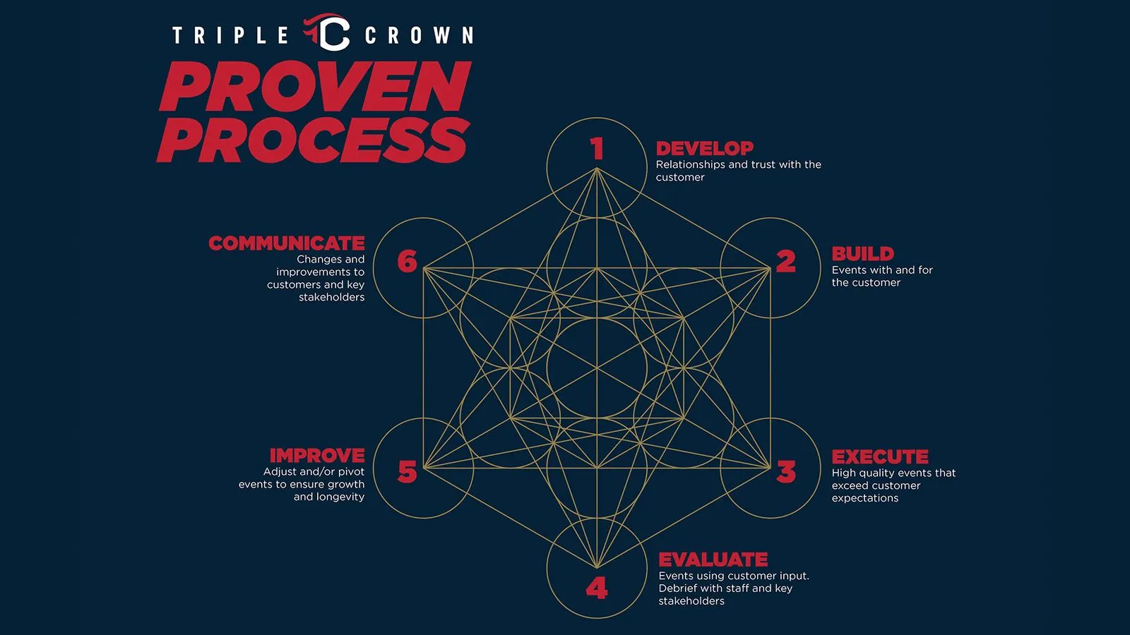 The Triple Crown Proven Process A Never-Ending Commitment to Excellence At Triple Crown Sports, success isn’t accidental—it’s designed. Our Proven Process is a purpose-driven, six-step approach that guides every event we produce.